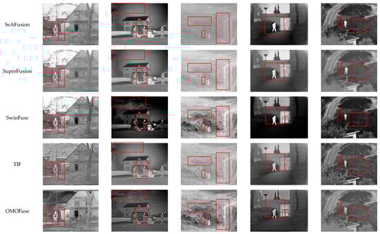 To demonstrate the visual effects of our OMOFuse method, Figure 1 provides examples in comparison with the advanced image fusion algorithm SeAFusion [22] across three image fusion datasets. Upon manual visual inspection, it is observed that infrared light delivers a superior performance in detecting the thermal imagery of human bodies compared to visible light, especially during nighttime conditions. In identifying the “fire” scenario, the scope of recognition by SeAFusion is smaller compared to OMOFuse; in the detection of the “human body” image, SeAFusion performs on par with OMOFuse, although the degree of blurriness and transparency in the “human body, umbrella” portion is higher in the SeAFusion algorithm than in OMOFuse. In the third scenario, SeAFusion turns out more blurred with less sharpness than OMOFuse, resulting in less intensely captured image boundaries. Therefore, overall, OMOFuse surpasses SeAFusion with higher clarity, lower fuzziness, and a greater capacity to capture edge information, marking an overall enhanced performance.