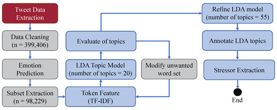 To obtain well-indicated stressors related to climate change topic, collected tweet data undergo a refinement process during which Twitter’s emoji, hexadecimal images, special characters, hyperlinks, and unwanted words are removed. We also deploy an emotion classification model to extract tweets with negative emotions to emphasize the stressors’ factors. Then, we apply a lemmatization process to avoid redundancy due to words with the same meaning represented as different forms (e.g.,: go, going, and went are the same verb with a different form due to grammar). Next, we remove English words that are commonly used but contribute little to no meaning to the context, such as “a”, “an”, “the”, and so on. This set of words is known as stopwords, and our process continuously updates this set of words by passing our text data several times under an unrefined Latent Dirichlet Allocation model until our topics are well-refined. Afterward, we calculate the term frequency–inverse document frequency (TF-IDF) score for each token before running a fine-tuned LDA model to find underlying topics in the tweets. We construct an LDA model with 20 topic components to filter out tokens that are exceedingly common in each topic, such as disaster information (e.g., “harvey”, “storm”, and “wind”), locations (e.g., “texas”, “houston”, and “antonio”), and unwanted tokens that the filtering process fails to catch. This process is iterated several times until words with minimal occurrences among topics start to emerge. The initial model acts as a filtering layer and does not require refinement. However, we aim to avoid a low number of topics as it leads to more overlap between them. Finally, we refine the LDA model to form explicit topics by fine-tuning the model’s hyperparameters so that we can manually extract stressors on climate change topics precisely. The described procedure is illustrated as Figure 1.