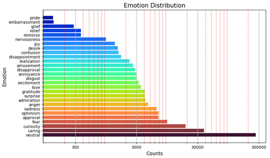 We executed the EmoRoBERTa model on a system equipped with an Intel i7-11700 processor, 32 GB of memory, and an NVIDIA RTX 2060 Super to assign emotion tags to each tweet. We then selected the emotion tag with the highest score for each tweet. This process consumed more than 14 h to process and annotate each tweet with its corresponding emotion. Among the results, there were over 250,000 tweets categorized as “neutral”. This outcome is understandable, as the majority of these tweets likely pertained to updates on the progress of Hurricane Harvey or warnings about potential dangers. Given that some emotions like “grief” or “embarrassment” had relatively low frequencies compared to “neutral”, we adjusted the distribution count axis to magnify their visibility. The distribution of emotions related to the tweeter data is visualized in Figure 2.