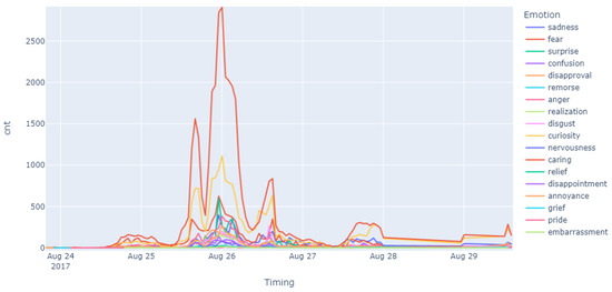 Table 2 and Figure 4 present the counts of tweets per emotion tag and their trends, respectively. In Figure 4, we see that ‘caring’ was the most common emotion for the tweets related to this natural disaster throughout the majority of the time. We see that ‘caring’ built up between 24 August and was closely trailed by ‘curiosity’ and ‘fear’. By the time we get to noon on 25 August, ‘curiosity’ overtakes ‘fear’ as the second most common emotion and maintains that position fairly steadily. On 26 August, it appears that many Twitter users expressed ’surprise’, which closely trailed ‘fear’, the third most-common emotion. However, there are a range of emotions that the data support for this day, and most notably, ‘anger’, ‘disgust’, ‘annoyance’, ‘disappointment’, and ‘disapproval’ shed light that many users may have expressed frustration with how the disaster preparedness and response was handled by local, state, and federal agencies or even how their own neighbors and fellow residents were handling evacuation and other measures taken for disaster safety. There are four phases of emergency management that are addressed by FEMA and other agencies, and these are mitigation, preparedness, response, and recovery. Therefore, understanding the sentiments and emotions of the general public leading up to, during, and after a disaster is a helpful tool for understanding the performance of these emergency agencies at all levels of government and for nonprofit efforts.