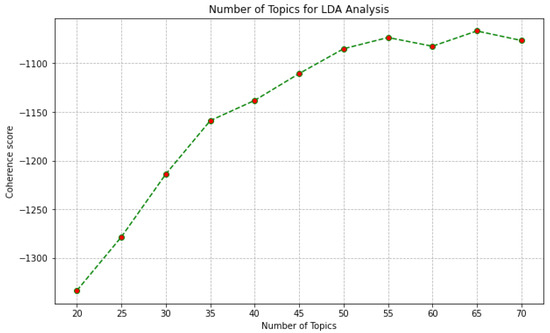 We conducted a search for the optimal number of topics for the LDA model using the scikit-learn library with a learning rate of 0.7 [46]. To determine the most suitable number of topics for our model, we constructed multiple LDA models by varying the number of topics from 20 to 70 in increments of 5. Subsequently, we computed the UMass coherence score [44] for the top 30 terms in each model and plotted the results in Figure 5. Particularly, at 55 topics, we observed a significant decrease in the rate of improvement in terms of the UMass score for our LDA model. Consequently, we decided to select 55 topics as the optimal number to use for constructing our LDA model. Since the number of topics is not so big, we can conduct manual extraction of stressors from these topics and their representative terms. The extraction process involves defining the stressor name represented for each topic and choosing representative terms from the most frequent terms that appeared for that topic. Two researchers conduct the extraction. The extraction step can only move forward if the two agrees on both the stressor’s name and the representative terms. Otherwise, new definitions are proposed.