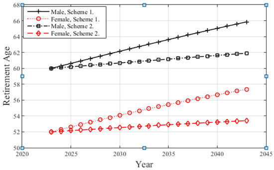 Projected retirement ages for men and women under two delayed retirement schemes.