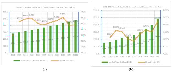 (a) 2012–2022 Global industrial software market size and growth rate; (b) 2012–2020 China industrial software market size and growth rate.