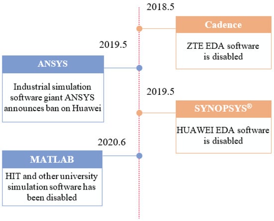 According to the statistics of the White Paper on China’s Industrial Software Industry (2020), the market size of China’s industrial software in 2020 was 197.4 billion CNY, accounting for only 6% of the global industrial software market size, with a year-on-year growth rate of up to 15% (see Figure 1). In 2020, for example, China’s industrial-added value exceeded 31.3 trillion CNY, accounting for nearly 30% of the world’s total. Although the scale of the industrial added value industry is huge, the proportion of China’s industrial software market in the world is too low, resulting in a very strong domestic demand for industrial software [5,6]. Since 2020, with the continuous spread of COVID-19 worldwide and the increased risk of anti-globalization in the international situation, China’s economic development environment has undergone great changes, and the policy of “new pattern of internal circulation” has become the main line of our future economic and social development. In the process of high-quality development into a “manufacturing power”, China is also facing a series of problems from the “bottleneck” of industrial software in Europe and the United States. As shown in Figure 2, such as the United States banned ZTE and Huawei from using industrial software related to chip design of integrated circuit Electronic Design Automation (EDA), and then prohibited some domestic universities from using MATLAB software (MATLAB Campus Edition) in course teaching [7]. Based on the above research background, we find that the state attaches special importance to the development of the industrial software industry and has formulated promotion policies through relevant departments, which also shows that the government recognizes the important role of industrial software in promoting the growth of the industrial economy. In October 2022, China’s “Report to the 20th National Congress” emphasized the need to “accelerate the construction of a modern economic system, strive to improve total factor productivity, and strive to improve the resilience and safety level of industrial and supply chains. In addition, the “14th Five-Year Plan for the Development of Software and Information Technology Service Industry” issued by the Ministry of Industry and Information Technology of China in November 2021 has a more detailed plan for the future development of industrial software.