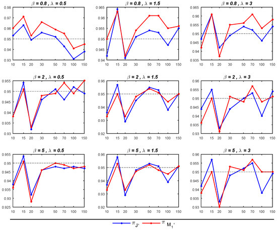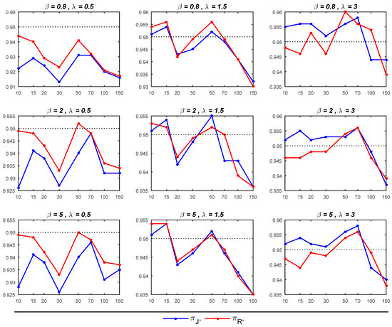 - The Bayesian estimator of exhibits better performance under , particularly when compared to , as it yields smaller MSEs. When both and are greater than 1, the 95% credible intervals derived from closely approximate the nominal level of 0.95, outperforming the corresponding intervals under . In other cases, the 95% credible intervals behave similarly for both priors. Moreover, for sample sizes exceeding 30, the 95% credible intervals not only approach the nominal level but also demonstrate greater stability.