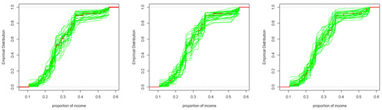 Figure 5 reveals that the empirical cumulative distribution of income proportions for 38 households closely aligns with the cumulative distribution of the 30 predictive samples. For further assessment, we compute approximate described in Section 5. It is worth mentioning that the calculation of D requires the computation of the expected value and the variance for the ULL distribution. Unfortunately, their values can not be obtained in a closed form, and hence we use numerical computations to approximate these quantities. We generate 1000 samples of from the joint posterior distribution of given the observed data. For each we generate a random sample say of the same size of the observed data from the ULL distribution. When we utilize the discrepancy measure defined in Equation (18), we obtain a set of pairs of discrepancy measures for observed and replicated data sets as follows: