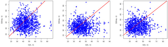 Figure 6 shows a scatterplot of the observed discrepancy; and the predictive discrepancy; using the priors , , and . The approximate can be computed as the proportions of points above the line in each panel in the figure. The values are, respectively, 0.35, 0.38, and 0.40. These high values indicate that the Bayesian model demonstrates compatibility with the current data.