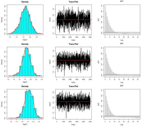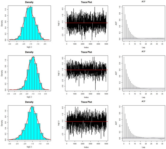 The Bayesian analysis of the current data set is conducted using , , and priors, chosen due to their demonstrated compatibility with the Bayesian model and the data. We compute Bayesian estimates employing the squared error loss function. To derive the Bayesian estimates for and , we generate 5500 MCMC samples from the joint posterior distribution of and using the random-walk Metropolis–Hastings (MH) algorithm, with a burn-in of 500 iterations. To assess the convergence of the random-walk MH algorithm, we employ graphical diagnostic tools, including trace and autocorrelation function (ACF) plots. The trace and ACF plots for are presented in Figure 7 under the specified priors. Similarly, Figure 8 illustrates the trace and ACF plots for under the introduced priors. Notably, the trace graphs depict scattered paths around the mean values represented by solid lines for the simulated values of and . Additionally, the ACF plots demonstrate minimal auto-correlation, with ACFs approaching zero. These plots signify the fast convergence of the random-walk MH algorithm using a proposal bivariate normal distribution. Furthermore, Figure 7 and Figure 8 reveal that the marginal posterior distributions of and closely resemble Gaussian distributions, indicating the appropriateness of the bivariate normal proposal distribution.