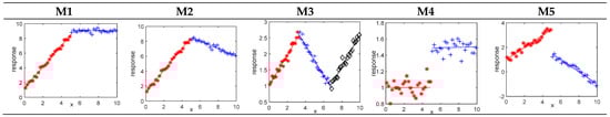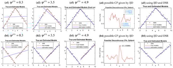 Two samples were generated individually from the above two models with each having 50 points and regression errors following normal distributions, with . From extensive simulation results, we observe that when the initial values of x are far away from the true change-point 5 such as or , DSR fails because data points are too few to obtain estimates of regression parameters. For , the DSR algorithm can converge, but it may result in inadequate estimates, such as the fitted results shown in Figure 3a1,a2,b1,b2; on the other hand, if initial values are close enough to the true value, DSR produces an estimated model of good fit such as the cases depicted in Figure 3a3,b3. These results illustrate that proper initial values are critical to the success of DSR. Next, we describe the IJD method for selecting suitable initial values to be used in DSR.