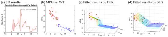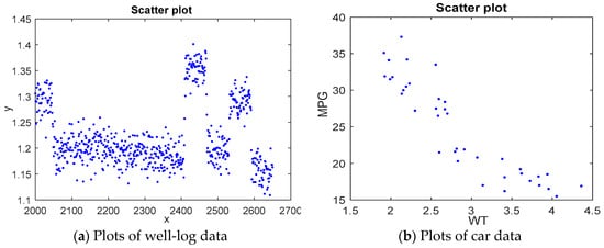 Change-point regression problems occur in many fields such as molecular biology, medicine, climatology, engineering, and econometrics [,,,]. In medical science, segmented regression models are employed to see whether the effect of some risk factor on the response alters abruptly. For example, the risk of cancer is low for young people, but the risk rises quickly for people of age beyond a certain age threshold []. In the oil and gas industry, sequential well-log data often appear as abrupt jumps at the transitions of rock strata. Each change-point in the well-log sequence indicates that a new rock type is encountered. Thus, change-point detection is crucial in oil-drilling. An example of well-log data from [] was analyzed via many different change-point methods [,,,]. Figure 2a displays data plots of the indexed measurements from 2000 to 2650 in the well-log data set and discloses five discontinuous jumps in the data series. Moreover, piecewise regressions are also serviceable for clustering objects into groups based on a certain explanatory variable. For instance, one may want to classify cars based on the relationship between fuel efficiency (measured by miles per gallon, denoted by MPG), weights (WTs), and horsepower (HP). The graph of a data set taken from [] shows a discontinuous and nonlinear relationship between MPG and WT (see Figure 2b).