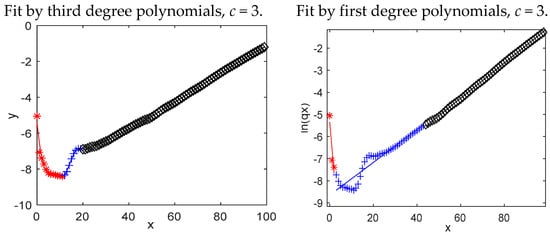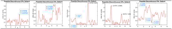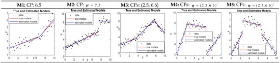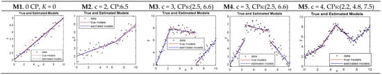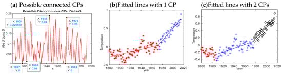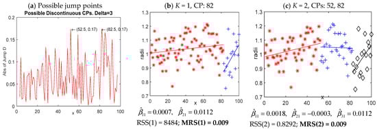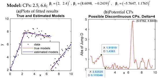where RSS is the residual sum of squared errors and K is the number of change-points. Thus, the proposed IJD method is not only helpful for recognizing possible jumps but also useful for finding potential continuous change-points. Furthermore, the closeness of the detected possible change-points by IJD to the true ones is beneficial for speeding up the convergence of the algorithm and increasing the precisions of the estimations. This example shows the proposed IJD method is useful for finding appropriate initial values to derive sufficient estimates. Summarize the rule for determining the possible jump points and connected change-points as follows: consider those points having , , with a fixed m ( and were defined above in this sub-section) as possible jump points, such as those denoted by black coordinates in Figure 4. Then, find possible connected change-points in the interval where the variations of are relatively larger than those in other places. As noted by Seber [], piecewise regression models are intended for circumstances where the number of change-points is small. Muggeo [] also commented that a few change-points (maybe from one to three) are probably enough for handling realistic situations since the meaning of change-points may become doubtful as the number of regimes increases. Therefore, the IJD method should be serviceable for finding potential jump points and connected change-points.