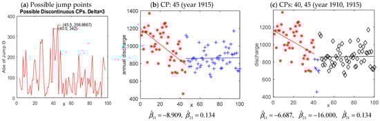 We employ DSR to the data set including measurements of the annual volume (in 108 m3) of discharge from the Nile River at Aswan, from year 1871 to 1970. The researchers [,] wanted to know whether abrupt changes in the mean of the annual discharge occur at some time points during this period. The plot of the data shown in Figure 9b reveals that the mean discharges decreased with time from the beginning (year 1871), followed a markedly large decrease around point 40 (year 1940), and then remains constant after the time of extremely low discharge. Figure 9a shows two possible jumps at time points 40.5 and 45.5. Thus, we fitted the data with models of two and three segments, respectively. Figure 9c indicates that the annual mean discharge decreased with time significantly () before point 40, i.e., year 1910. Note that the jump detected at 40.5 is because of the occurrence of an exceptionally low discharge around point 40. As commented by Cobb [], the abnormally low change is real and can be found in the records of tropical weather stations. Both models (b) and (c) in Figure 9 demonstrate that the mean annual discharge remains constant around 861 (in 108 m3) after point 45 (year 1915). As remarked by Zeileis et al. [], the unchanged mean discharge from the Nile River after 1915 may be partly attributed to the operation of the Aswan dam, starting from 1902.