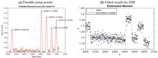 In this example, we employ DSR to the well-log data (c.f. []), which include 4050 measurements of nuclear magnetic response obtained when digging a well. Sharp shifts in the mean of the process measurements often occur at the transitions of rock strata. Thus, locating change-points is crucial for oil drilling (c.f. [,]). We applied DSR to a subset of indexed measurements from 2000 to 2650. DSR resulted in five potential discontinuous change-points at 2046.5, 2409.5, 2469.5, 2531.5, and 2591.5, respectively, which are close to the apparent five jumps shown in Figure 11b. The final estimated model with five abrupt jumps at 2046, 2409, 2469, 2531, 2591 is reasonable. Thus, the proposed DSR identified the five jump points properly.