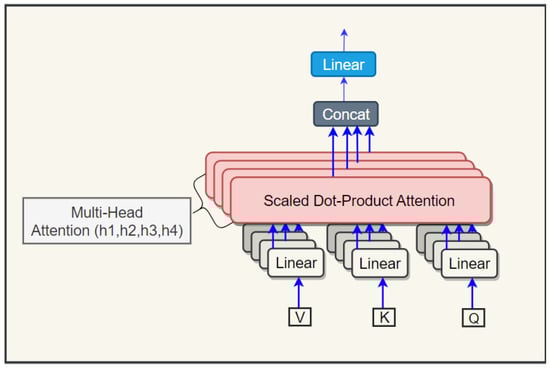 The self-attention mechanism (SE-A) is a key component of the seq-2seq design, and it is utilized to solve an array of sequence-generation problems, such as NMT and document summarization [53]. Figure 2 shows how the T-TC-INT model for ADs accomplishes the scale-dot product attention function. This function uses three vectors as inputs: queries Q, values V, and keys K. It describes the given query and key–value pairs as a weighted sum of values. The weights reveal the relationship between each query and the key. The following is an explanation of the attention method.