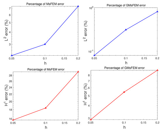 Percentages of and norm errors from MsFEM and GMsFEM on log-log scale.