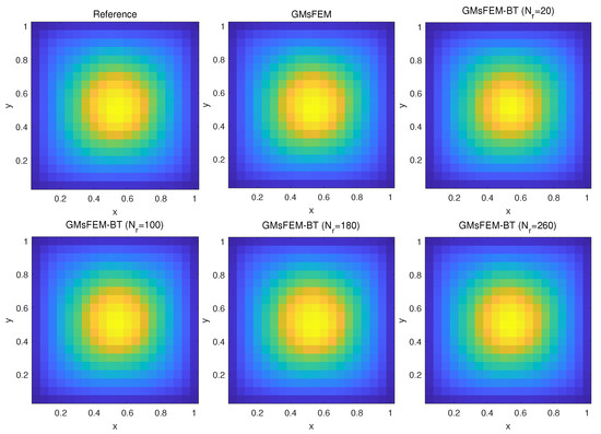 We are quite interested in comparing the simulation behaviors from the fully-resolved fine system, the coarse system and the reduced system. We set the refinement of N = 5, 10, 20, and the fine partition is kept as in each coarse element, then on both directions in the 2D problem the number of coarse vertices is = 36, 121, 441. Then the matrix size of the fine system is = 2601, 10,201, 40,401, while the corresponding matrix size of the generalized coarse system is 207, 988, 4293, which is much smaller than and is a bit larger than . In contrast, the matrix size of a reduced system is , which would be chosen as smaller integers in the following.
