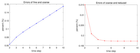 With time elapsing, error percentages between fine and coarse (left), and between coarse and reduced number (right).