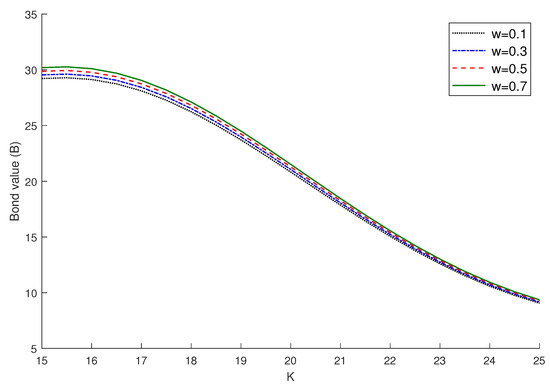 Figure 1 shows bond values against strike price K for four different recovery rates in the proposed model. From Figure 1, we observe that bond values decrease for the strike K from 15 to 25 and have similar values for sufficiently large values of K. Also, as expected, we note that bond values increase as the recovery rate w becomes higher. In other words, the bond prices are higher when there is little credit risk by the counterparty compared to high credit risk cases. Figure 2 shows the bond values against the time to maturity T for different values of recovery rates. The bond values increase with an increase in both T and w.This means that bond prices are an increasing function of maturity. We can also see that the function is exponential, not linear.
