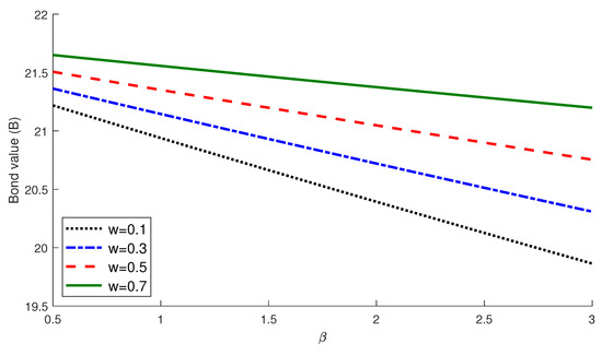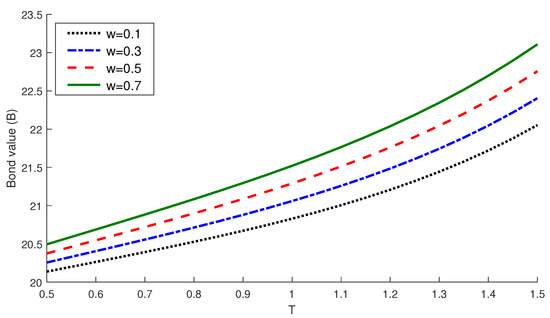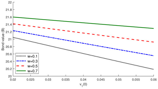 Figure 3 shows bond values against values in the intensity process. We observe that, as grows larger, bond values decrease, as expected. That is, the bond prices are a decreasing function of for all recovery rates. This is because the value of the intensity process increases as increases. As a result, the probability of a default increases, and the prices decrease. Also, because values affect the intensity process, has little impact on the value of bonds when w has a large value (close to 1). Figure 4 shows bond values against initial volatility of the dynamics . We can see that the bond prices are decreasing linear functions of for all recovery rates. That is, from Figure 4, we find that bond values fall as increases. This is because a higher level of connects to a larger default probability.