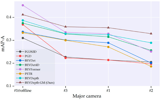 Comparison of streaming performances on our benchmark, where the model rank changes based on the variation in streaming inputs. The BEVDepth-GM detector (built on BEVDepth [4]) equipped with our switcher achieved better streaming performance on different major cameras. Major camera designations #1, #2, and #3 serve as the primary subjects for our online testing, with detailed specifications provided in Section 4.2. Specifically, the notation “@offline” indicates the utilization of offline evaluation.