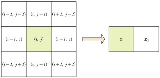 where is the frequency at which the feature pair appears, and the size of is . In our implementation, is derived from the eight adjacent neighbors of the center pixel, as depicted in Figure 4. The discrete fractional two-dimensional entropy is defined as follows: