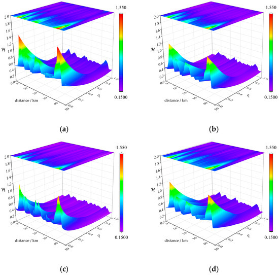(a–d) depict the contour plots of the distributions in w1, w2, w3, and w4, where w1 corresponds to clear noon, w2 to rainy noon, w3 to clear night, and w4 to rainy night. It is evident that, relative to the case where is equal to 1 (Shannon’s entropy description), the fractional dimensional order with taking values within the range of (0, 1) provides a significantly more sensitive elucidation of the critical nodes in the benchmark scenario.