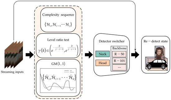 The streaming input updating switcher, where the GM (1, 1) is utilized to predict the future complexity of streaming inputs and is used as a basis for switching the backbone structure in the detector switcher and updating the re-detect state.