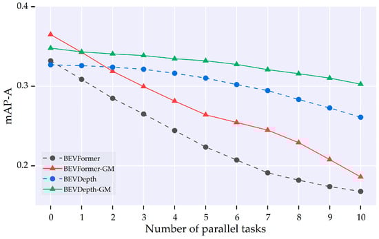 Comparison of the streaming performance of BEVFormer, BEVFormer-GM, BEVDepth, and BEVDepth-GM on major camera #1 under computational resource sharing. The x-axis denotes the number of parallel ResNet18-based classification tasks.