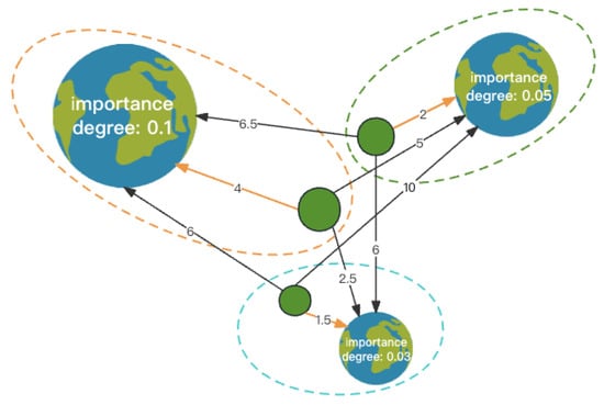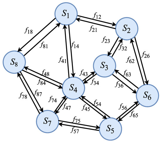Figure 1. Bicycle transfer graph. - Station Importance Degree Matrix;The initial importance degree matrix for each station is defined as the proportion of bicycle usage at each station to the bicycle usage at all stations in a certain time period. Assuming there are nodes in the bicycle transfer graph and that the total bicycle usage in this period is , the bicycle usage of station is ; the calculation formula for the initial importance matrix is shown as follows: