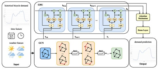 This paper proposes a deep learning model for bicycle demand prediction. The input features include historical bicycle demand data in various regions, time-related feature data, and corresponding weather feature data at the same time. Firstly, the GCN is employed to capture spatial correlations, and then a multi-layer GRU is designed to learn the associations between time series. Additionally, an attention mechanism is adopted to extract historical time step data information and inter-regional features with different weights, enabling the final model to have a good ability to predict demand. Finally, the dense layer outputs the bicycle demand in each time period for the 26 clustered regions. The model includes the input layer, the GCN layer, the GRU layer, the attention layer, and the output layer, as shown in Figure 4 [17].