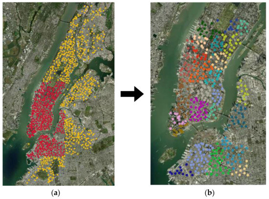 The usage of bicycles in a shared-bicycle system is influenced by multiple factors such as the bicycle’s time of use, weather conditions, and the unique relationships between stations [16]. This implies that the demand for bicycles varies significantly depending on these conditions, which makes it difficult to capture its regularity and predictability. By aggregating stations with similar characteristics, the accuracy of demand prediction can be improved, especially when compared to analyzing individual stations. Additionally, the users’ riding habits are not limited to one station, so when users cannot find bicycles at their current station, they will go to nearby stations to search for bicycles. When users want to return their bicycles but find that the parking spots are full, they may also go to nearby stations to park their bicycles. Therefore, the proximity between stations has some correlation from the users’ perspective [6].