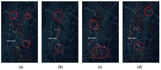 This study collected hourly weather report data for New York City from July to August 2021 to complement the analyzed Citi Bike dataset [23,24]. The weather report data from Weather Underground includes hourly reports for various weather parameters in New York City during this period. The report format consists of timestamps, wet bulb temperatures, dry bulb temperatures, humidity, pressure, and wind speeds. It should be noted that the original data may contain missing values for wind speed and humidity. To ensure the continuity of the meteorological data, this study employs a method for filling in the missing values using the previous hour’s weather report data.