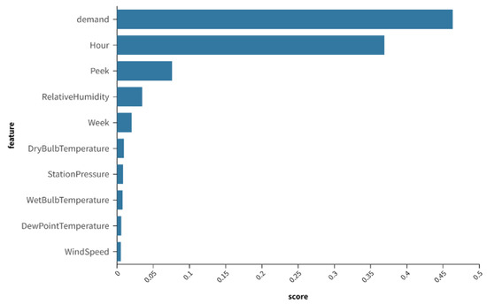 According to the feature analysis results in Figure 7, it is evident that the original demand sequence is crucial for model training. Hourly information, morning and evening peak indicators (represented by 1 and 2, respectively), and the weekday attribute (ranging from 1 to 7) also exhibit significant effects. On the other hand, weather features have a relatively smaller impact as compared to other features. However, they still contribute to improving the model’s demand prediction performance. In this study, selected weather features include temperature, humidity, and wind speed.