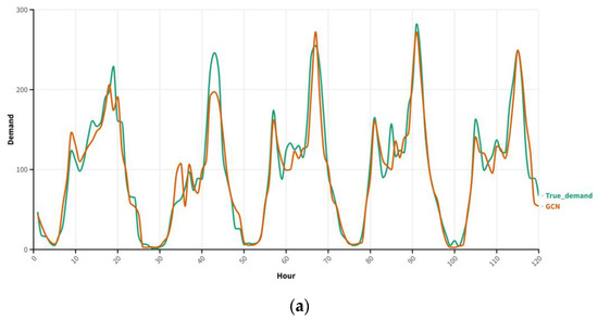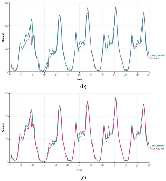 Comparison of the prediction result with the actual demand in Region 2. (a) Comparison of the GCN prediction results with the actual demand in Region 2, (b) Comparison of the GCN–GRU prediction result with actual demand in Region 2, and (c) Comparison of the GCNGRU–AM prediction result with actual demand in Region 2.