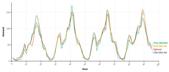 It can be seen from Figure 9 that each model has a certain deviation from the original demand when making actual predictions of working-day demand. Among them, the model with a larger error index has a larger performance deviation in actual prediction. The GCN–GRU–AM model used in this article hac the best performance and has a high degree of fit with the original demand curve.