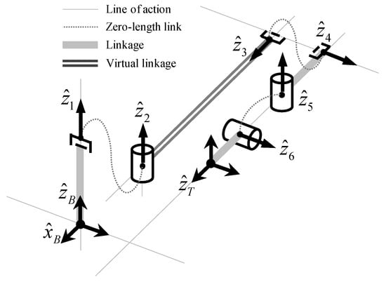 In this section, we derived the relationship between the joint rates and spatial twist in the fixed frame {s}. In the case of the FS-BS structure in this study, the end-effector frame {b} is located away from the last joint. At this point, it is worth understanding the nature of the PoE formula method in the body form that the body frame representation of the screw axis for a more distal joint is not affected by the joint displacement at a proximal joint according to Definition A4. Therefore, to obtain the spatial velocity for {s} at the origin of the frame {b}, the body Jacobian expressed for {b} should be derived first as in Equation (A4). We derive the screw axis of each joint in the frame {s}, , first and then transform to the screw axis of each joint in the frame {b}, through following adjoint transformation.