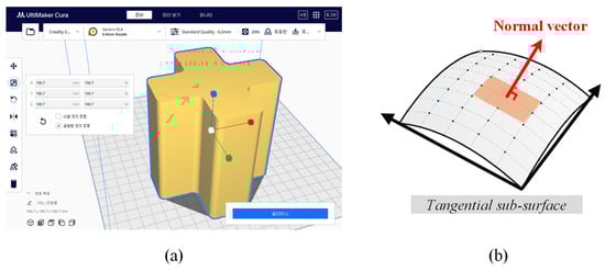 (a) Specification of scaling factor in the CURA slicer, (b) schematic diagram of determining tool orientation and tool path.