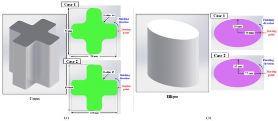 Geometric descriptions of two test models: (a) two cases of the cross shape and (b) two cases of the ellipse shape.