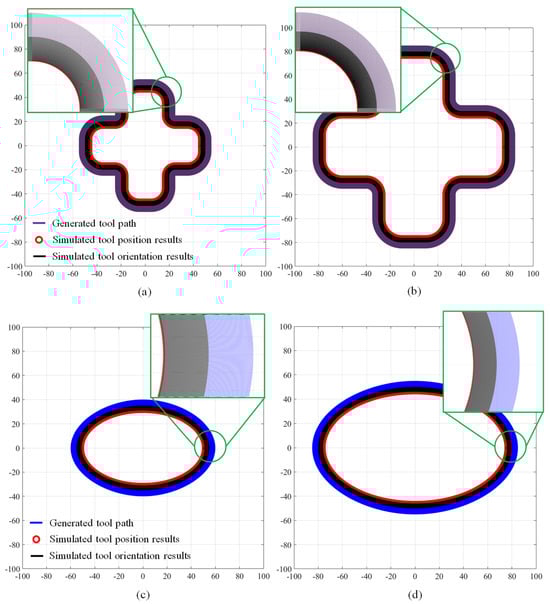 This section conducts a numerical analysis of a 3D-printed CAD model with the geometric shapes depicted in Figure 6 to verify the numerical accuracy of the optimal joint path planning algorithm proposed for FS-BS. Figure 6a represents a cylindrical structure with a cross-sectional shape consisting of straight and curved segments. Figure 6b illustrates a cylindrical structure with an elliptical cross-sectional shape exhibiting continuous curvature variation. Two cases were distinguished to evaluate the numerical accuracies of the optimal joint path planning based on the design parameters of the respective 3D print’s model: case-1 and case-2. In Figure 6a of the cross-shape, case-1 is designed with dimensions of 90 mm width and 90 mm height and a curved segment with a rotation radius of 10 mm. In comparison, case 2, which has an oversized area of 1.5 times that of case 1, comprises dimensions of 150 mm width, 150 mm height, and a curved segment rotation radius of 15 mm. For Figure 6b of the ellipse-shape, case-1 has major and minor axes of 50 mm and 35 mm, respectively, while case-2, oversized by 1.5 times compared to case-1, possesses major and minor axes of 75 mm and 45 mm, respectively. The analysis conditions for both test models start from the top-right center as the starting point, following a counterclockwise direction, as depicted in Figure 6. Interpolation was performed to achieve an incremental point-to-point displacement at approximately 0.025 mm.