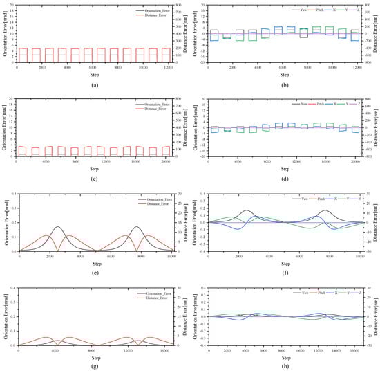 Consequently, the optimal joint path planning algorithm developed in this paper exhibits maximum distance and orientation errors of 201 nm and 2.62 nrad, respectively. With both the distance and orientation RMSE values—153 nm and 2.05 nrad, respectively—being smaller than ±10 μm and 20 μm, the precision of the tool path generation and general machining accuracy outlined in this paper fully meets industry requirements.