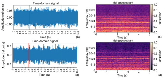 Sounds of two randomly chosen samples where the mid part of duration of 5 s—denoted by vertical lines—is extracted and mapped into mel-spectrogram: (a) time-domain signal and (b) mel-spectrogram of a sample from the slider class; (c) time-domain signal and (d) mel-spectrogram of a sample from the gearbox class.