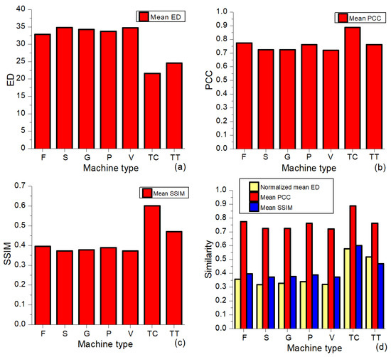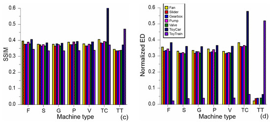 Mean values of intraclass similarity for the full dataset: (a) ED, (b) PCC, and (c) SSIM, as well as (d) normalized ED, PCC, and SSIM together; F is used for fan, S for slider, G for gearbox, P for pump, V for valve, TC for toy-car, and TT for toy-train.