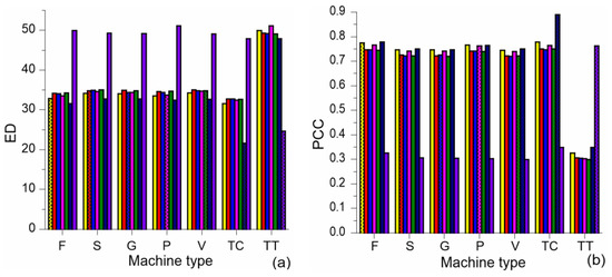 Visual comparisons of the mean intraclass and interclass similarity values are given in Figure 3 and Figure 4, wherein the intraclass similarity is presented by the hatched bars, while the interclass similarity is presented by the open (colored) bars. The order and color of the bars for the classes are the same in all the presented bar plots. Thus, the first bar in each set of bars for each particular class (machine type) represents the similarity for the fan class (yellow color), while the second one represents the slider class (red color), etc. The most obvious observation from these plots is that the greatest interclass similarity values are obtained for the pairing of toy-car with any other class (denoted as effect 1). It is interesting to note that these interclass similarities are even greater than the intraclass similarity for five classes—constituting all classes except toy-car and toy-train (effect 2). On the other hand, the smallest interclass similarity is obtained for the pairing of toy-train with any other class (effect 3). Comparing the noticed behavior in the results for the different similarity measures, all three effects are strong in the normalized ED. Effect 3 is prominent in all three similarity measures, while effects 1 and 2 are less prominent in the PCC and SSIM values.