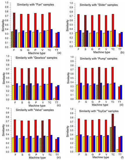 The intraclass and interclass similarities for all three measures and given per machine type (class) are presented in Figure 4. The bar plots are rather similar for the group of five classes from fan to valve. Here, the interclass similarity of these classes with any other class except toy-train is close to the intraclass similarity (although the interclass similarity with toy-car is slightly higher than with other classes), while the interclass similarity with toy-train is the smallest. The bar plot for toy-car, presented in Figure 4f, shows that the intraclass similarity is greater than the interclass similarities, and this behavior is even more emphasized in the toy-train class (see Figure 4g).