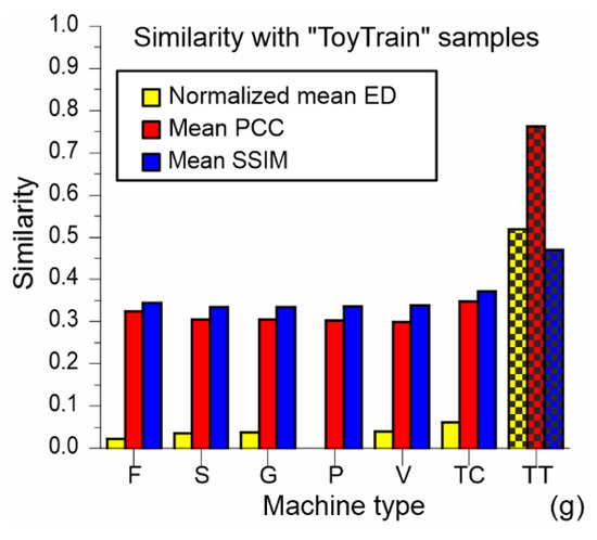 The statistical mean values of the similarity measures are given in Table 1, Table 2 and Table 3. In order to enable better visibility of the main trends, the obtained numerical values are also presented as bar plots. The mean values of the intraclass similarity for all three measures (ED, PCC, and SSIM) and the full dataset (see Table 1) are shown in Figure 2. The abbreviations used for the machine types (classes) in this figure are also applied in other figures. Comparing the presented values for the analyzed seven classes, it can be concluded that the intraclass similarity is the largest for the toy-car, followed by the toy-train and then other classes with very similar mean values. This observation is the most visible with respect to SSIM and ED, while the intraclass similarity of the toy-train class with respect to the PCC is similar to other classes, except that the toy-car class has the largest mean similarity value.