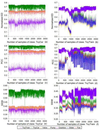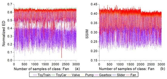 The overlapping of the line plots is even larger in the classes belonging to the group of five classes, which is shown as an illustration in Figure 6. The spread of the mean similarity values per sample in the individual lines for the fan samples is greater than the one for the toy-car and toy-train samples with respect to the results for all three similarity measures. This explains why the difference between the lines for different classes is not that obvious. The largest values belong to the interclass line for the toy-car class, which has slightly larger values than the intraclass line. The values of the intraclass line are similar to those of the interclass lines for all classes from the group of five classes. The smallest values belong to the interclass line for the toy-train class. Comparing the results for the normalized ED and SSIM, it can be seen that the main trends are the same, while there is a difference in the range of values for particular lines and their ratios.