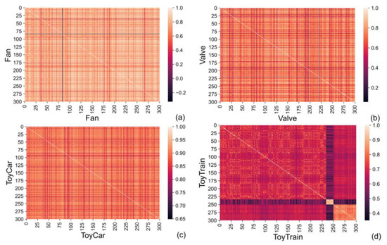 The intraclass similarity heat maps for four classes (fan, valve, toy-car, and toy-train) based on the PCC values obtained from the extracted dataset are shown in Figure 7. It is worth noting that the ranges of values in these maps are not the same, and the same color is associated with different values in different maps. Only few samples in Figure 7a have negative values with respect to the PCC, while all the PCC values in Figure 7b–d are positive. The majority of the fan samples have rather great PCC values (see Figure 7a). A similar situation exists with respect to the toy-car class, wherein the majority of samples have even greater PCC values, as shown Figure 7c. This is not the case with the valve samples, wherein there are samples with large to small PCC values (see Figure 7b). For these three machine types, it is interesting that the color is almost the same when moving along a particular line either in the horizontal or vertical direction. This means that a particular sample has similar PCC values with all other samples from that class present in the extracted dataset. On the other hand, the results for the toy-train samples are different: some samples can be grouped in sub-classes and further in sub-sub-classes (Figure 7d). This is manifested in the different colors of particular parts of the heat map, e.g., the dark-colored horizontal and vertical stripes or the light-colored squares in the bottom right of the heat map.