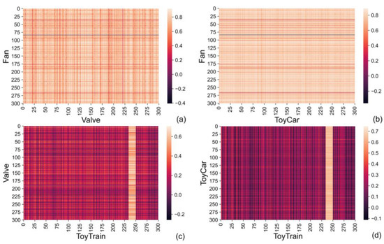 Similar patterns to those present in the intraclass PCC similarity heat maps from Figure 7 exist in the interclass PCC similarity heat maps. Four such heat maps are shown in Figure 8. The similarity values for a particular sample (machine) are rather consistent when moving along a horizontal or vertical direction representing the samples of one or another class, e.g., the fan and valve classes, as given in Figure 8a. The samples have different similarity values ranging from larger (closer to 1) to smaller (closer to 0), which are indicated by different colors shifting from lighter to darker, respectively. Samples with lower interclass similarity values are rare in the toy-car class in comparison to other classes; for example, observe the heat map values in the vertical direction in Figure 8b, where dark vertical stripes are hardly present. The most prominent characteristic of the toy-train class is the vertical, light-colored stripe found in both interclass similarities with the valve and toy-car classes (see Figure 8c,d). The different behavior of the toy-train samples within this stripe in comparison to the other toy-train samples is also visible in the intraclass similarity from Figure 7d.