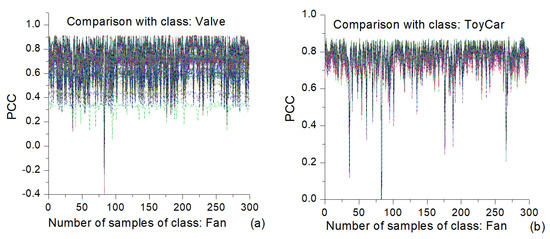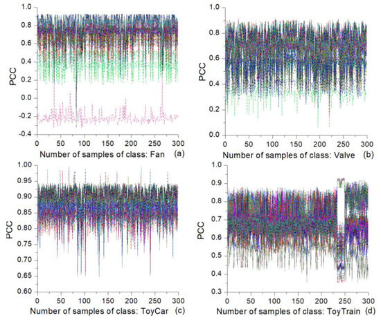 Figure 9 presents the intraclass PCC similarity line plots for four classes (fan, valve, toy-car, and toy-train). Each plot has 300 lines for the same number of samples present in each of those classes. In the fan samples (see Figure 9a), there is only one line in which the majority of its points have negative PCC values. This line belongs to a sample with a dark-colored line in the heatmap given in Figure 7a located in the vicinity of sample number 80. In all other lines, only very few points have negative PCC values, which are mainly associated with the above-mentioned sample. The samples from other classes in this figure do not have negative PCC values. The valve samples typically have values between 0.3 and 0.9, and the spread is rather large (see Figure 9b). On the other hand, the toy-car samples have the largest PCC values, and their spread is much smaller, as shown in Figure 9c, which is also observed in Figure 7c as the smallest variety of color of the heatmap. The majority of the values are between 0.80 and 0.95. As seen in the previous analysis presented herein, the toy-train samples show a different behavior. The majority of their PCC values range from 0.4 to 0.9 (see Figure 9d). There is a small sub-class of samples located in the vicinity of sample number 250 showing different characteristics.