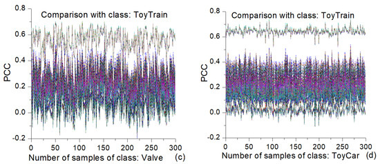 The interclass PCC similarity line plots for the chosen pairs of classes are presented in Figure 10. Here, each plot also has 300 lines, wherein each line is associated with a particular sample of a class stated at the top of the plot. Each of these samples is paired with all the other samples from the other class stated below the x axis. Similar to the case of the intraclass similarity from Figure 9, the range of interclass similarity values for the fan–valve pair is between 0.3 and 0.9, as shown in Figure 10a. On the other hand, for the majority of the samples, this range is much smaller for the fan−toy-car pair (see Figure 10b). The interclass similarity values for the pairs valve−toy-train and toy-car−toy-train are smaller than those for the previously mentioned pairs (see Figure 10c,d).